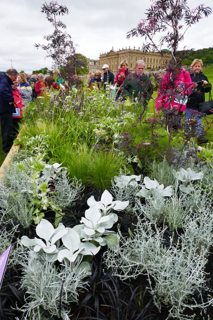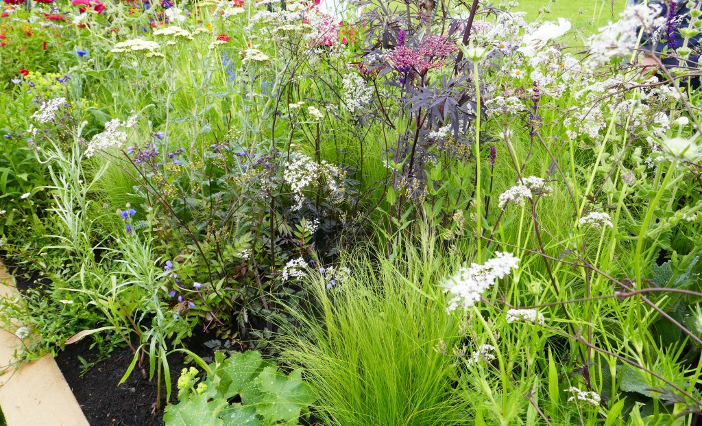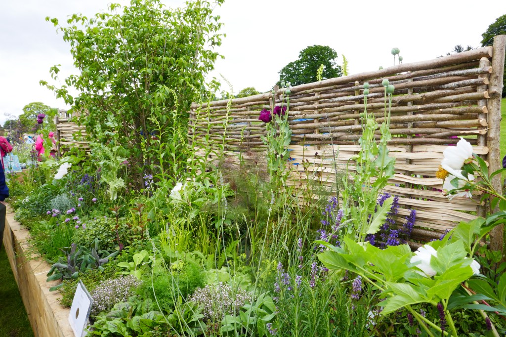The raised wooden beds are meant to be kept free of complications like water features and to focus on plants. The idea is that they’re inspired by the sort of long herbaceous borders we’d all like to have at home but sadly only see on visits to much larger gardens. The first picture above (with the willow hurdles) is the ‘Bess of Hardwick’ border which was awarded a Gold medal and was judged the best of the Long Borders. It takes its inspiration from Hardwick Hall.