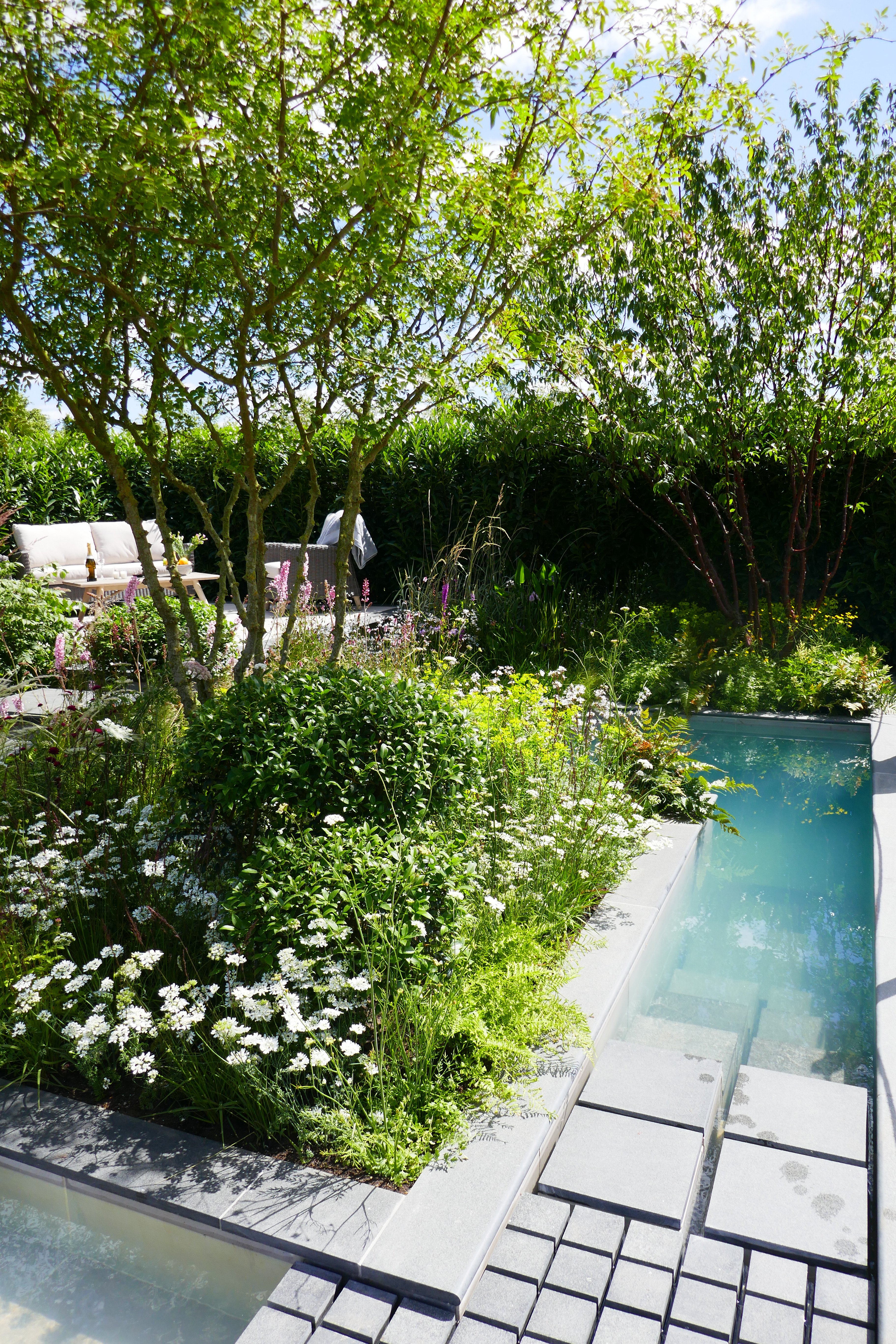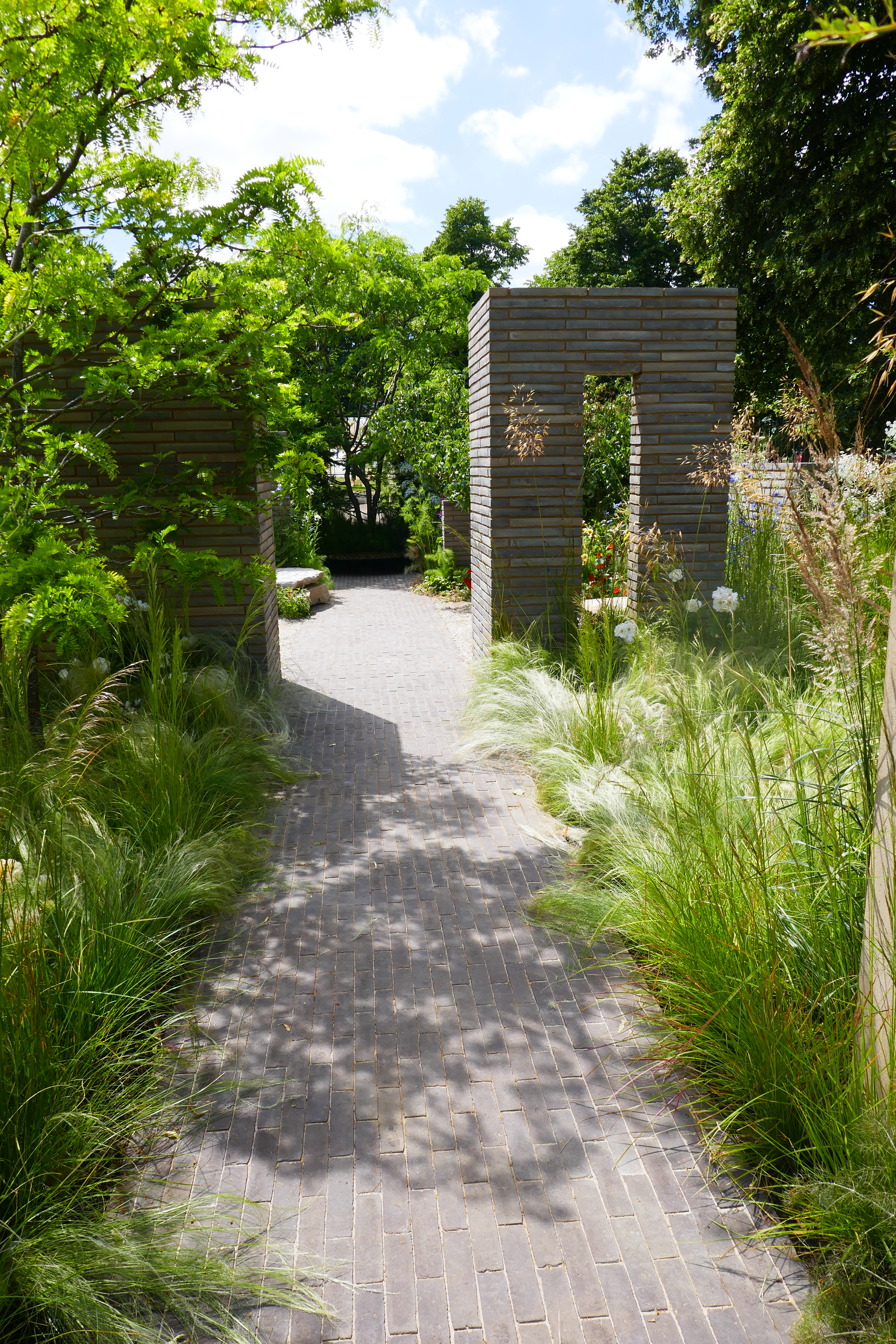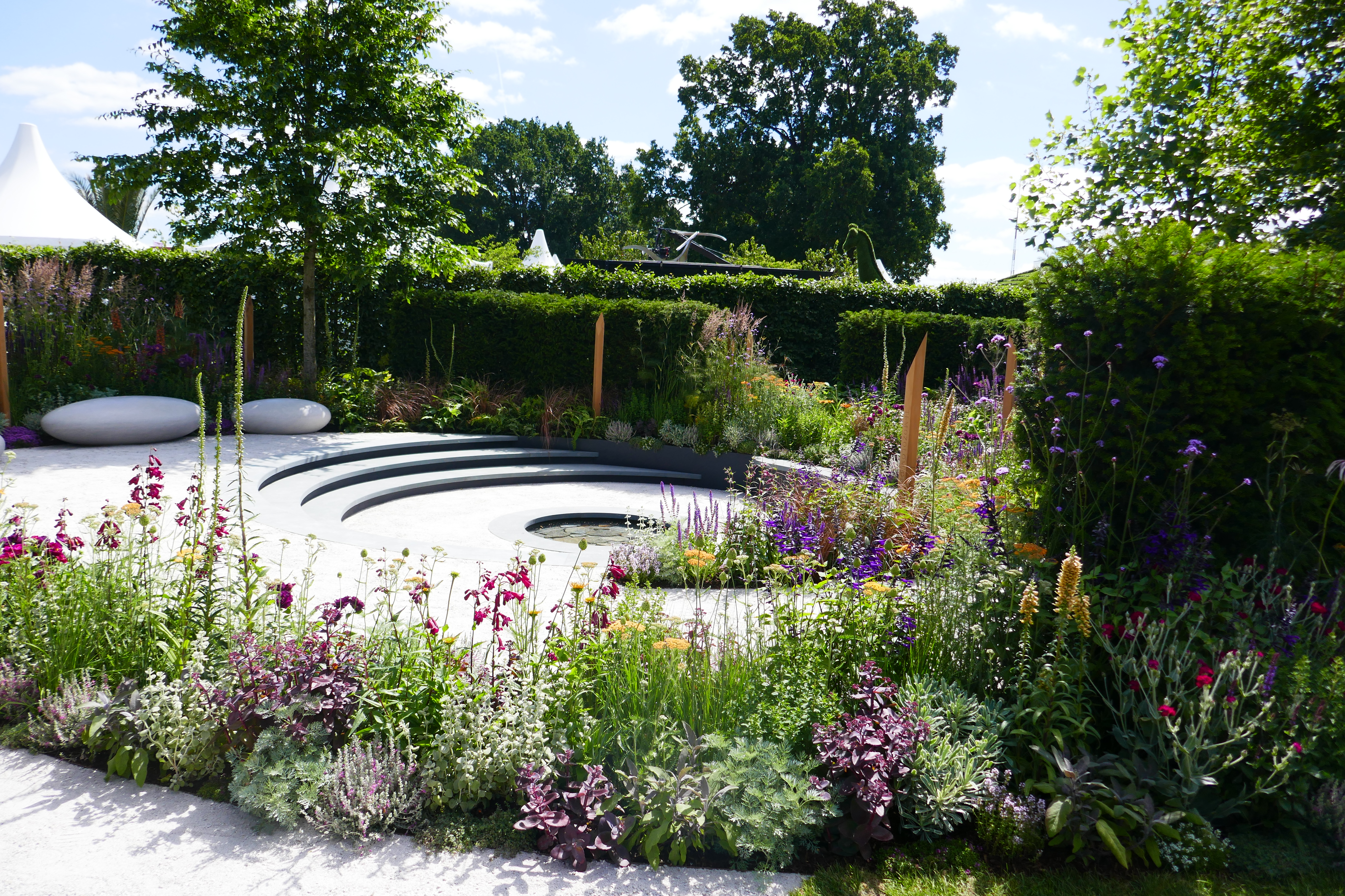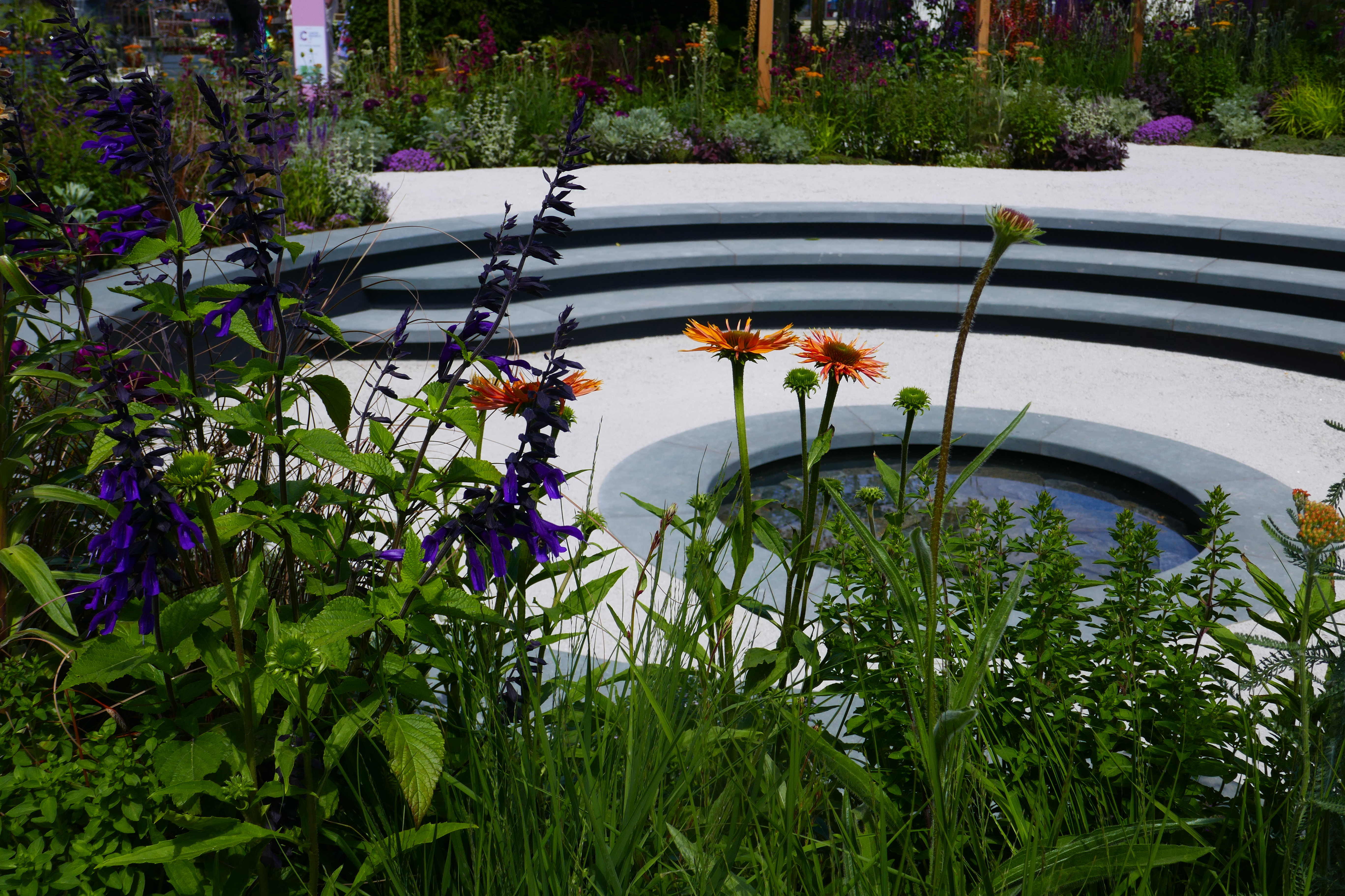 These two smaller show gardens particularly caught my eye. It was a hot day, so perhaps it wasn’t surprising that A Place to Meet (the two left hand pictures) looked so alluring, with its pint-sized plunge pool. How lovely to have one of these in your garden on a hot day, and it wouldn’t take up much space! The seating area was also very attractive and the planting looked natural and effortless, a sure sign of a designer who knows what they’re doing. The Cancer Research UK Pledge Pathway to Progress in the two pictures on the right was also beautiful, using circles and spirals to both illustrate its theme and to create a harmonious and very colourful garden that felt surprisingly calm and relaxing, despite the hubbub of the show all around.