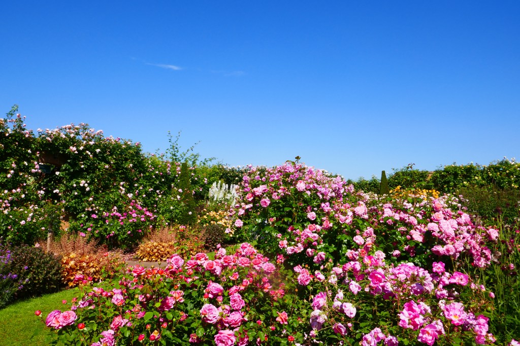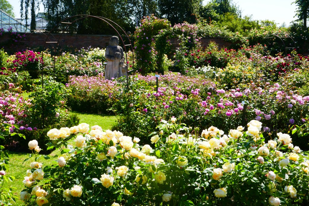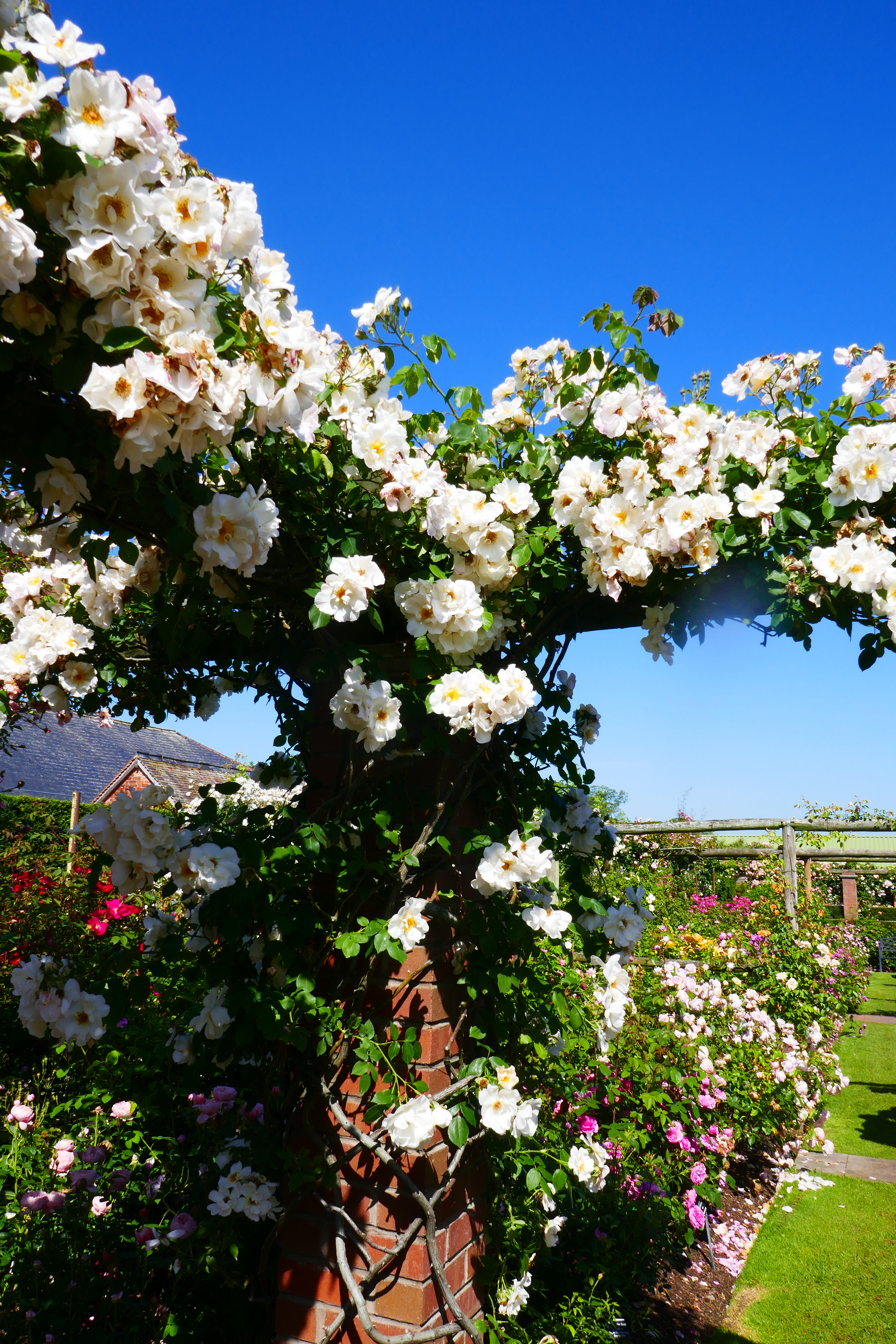 The garden is separated into several different areas. The Long Garden combines pergolas festooned with climbing and rambling roses above beds brimming over with colourful shrub roses.