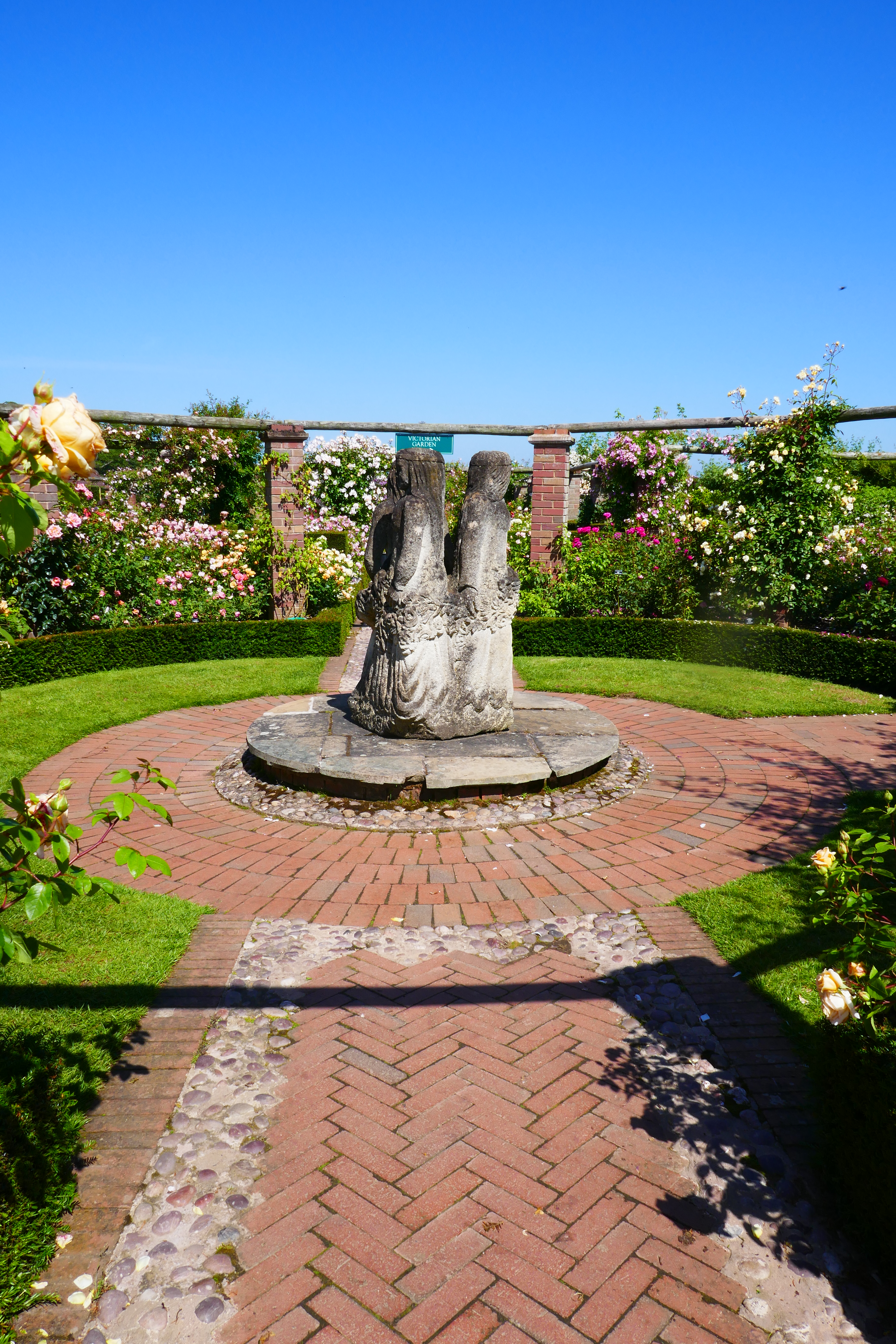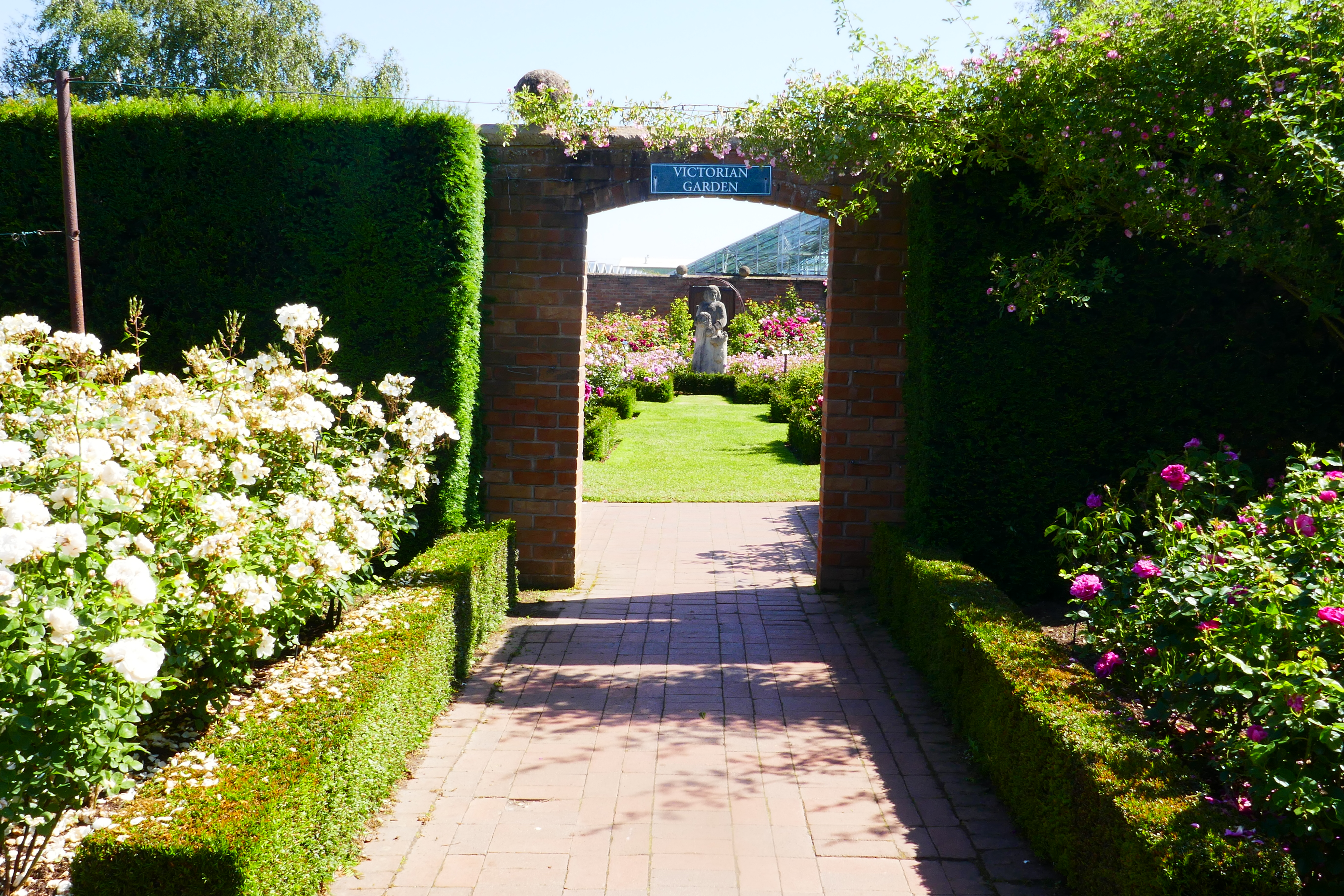The Victorian Walled Garden is more formal. There are three circular borders containing shrub roses, with climbers and ramblers trained over arches and growing on the surrounding walls.
