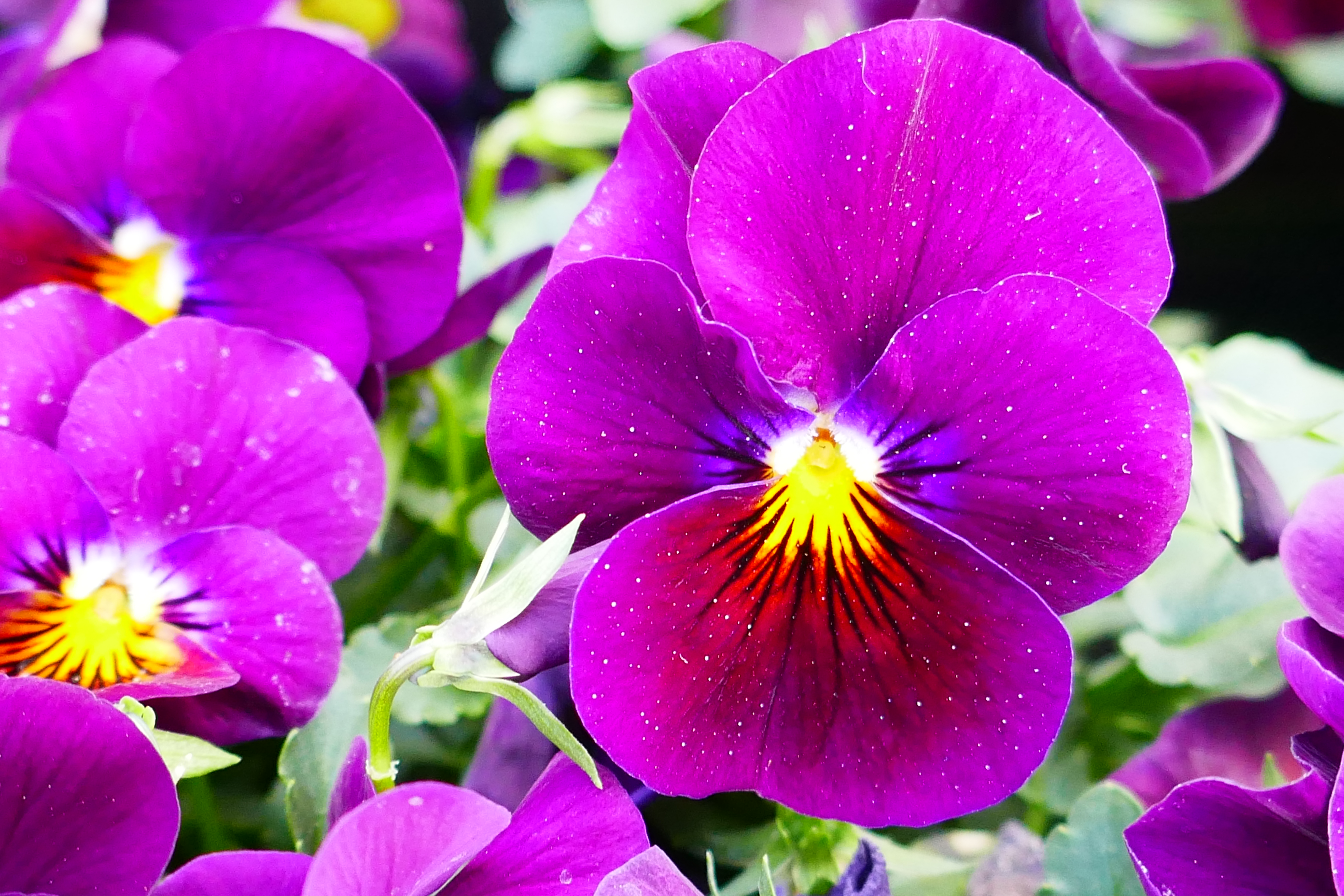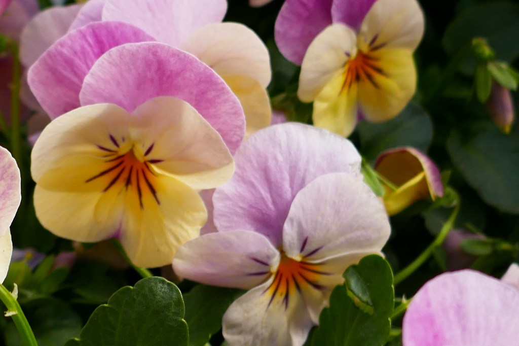 In fact they’re all viola of course, because they’ve been bred from different species of the same genus (viola). There are differences, though, and the most obvious is that pansies usually have bigger flowers than violas, plus, as they come from different species, there’s a difference in the structure of the flower. Pansies have four petals pointing up and one pointing down, while violas have three petals pointing up and two pointing down. You don’t need to remember that though! You just need to know that pansies really do have larger flowers but sometimes not that many, and their size means they can get damaged by wind and rain. Meanwhile violas have smaller flowers but many of them and they tend to be more robust in our climate. Plus, they’re beautifully scented.