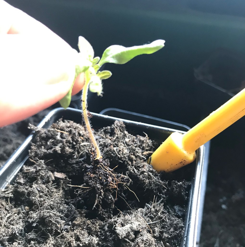 Hold one of the seed leaves so you don’t damage the real leaves or the stem. Push your dibber into the soil, a little way away from the base of the stem and work it down to the bottom of the container. Wiggle it around gently so you get underneath the roots and carefully tease them free of the compost, then lift the plant by the seed leaf.