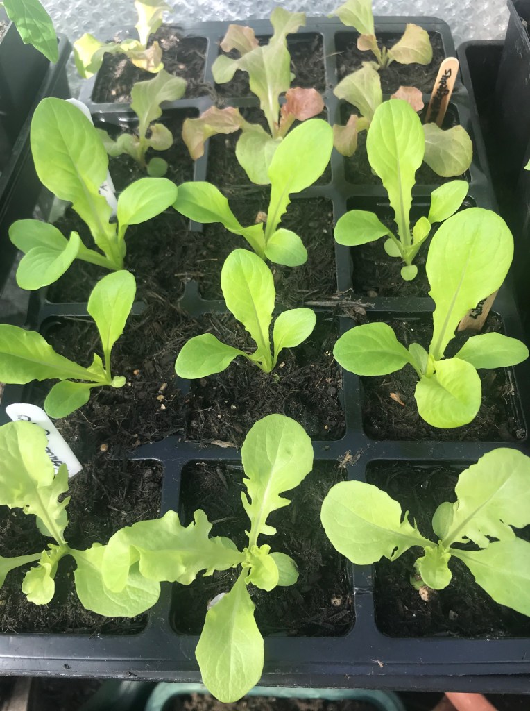 I will usually start planting out the hardier veg types first, especially if they’re ready in late April or early May when tender stuff needs to be kept inside a bit longer. So I’ll take all the brassica and lettuce plants, the onions and the leeks down to the allotment first and get them in the ground. I keep some cut and come again lettuce, rocket and pea shoots in pots in the garden.