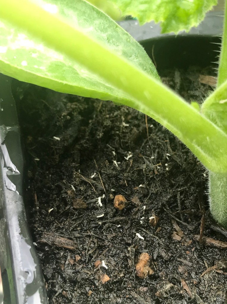 ‘Plant dandruff’ on the compost. As aphids grow they discard their skin several times and this falls onto the surface of leaves and onto the compost where it’s very visible, making a good tell-tale sign of the early stages of an infestation. Check underneath the leaves and you’ll find the little blighters happily feeding and breeding. A few aphids soon become a large colony (they are borne pregnant) so at this point I gently but ruthlessly squish every single last one of them I can find.