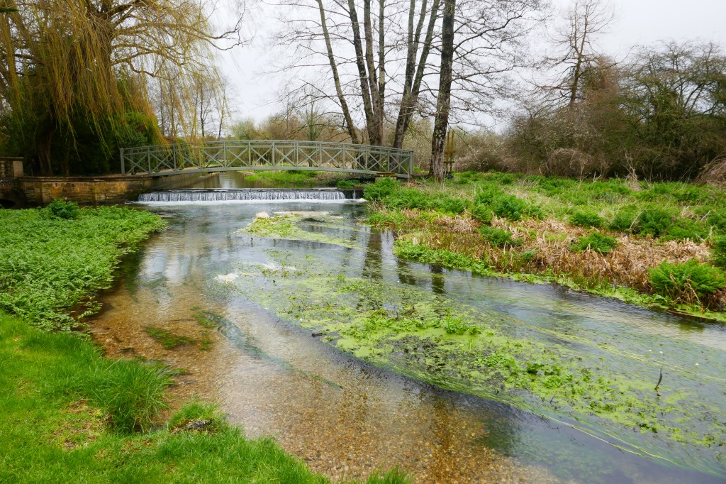 From one lovely feature to another, more natural one, as I walked on to discover that the river Piddle runs through the garden. Shallow at this point but quite fast flowing, the banks were just springing into life and the weeds in the water created dark green streaks under the surface.