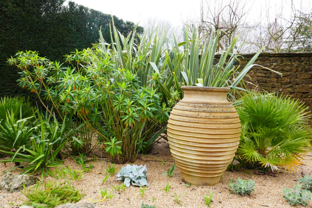 The next courtyard was a complete contrast. Altogether lighter, planted with tender (or tender-looking) exotics: Tetrapanax papyrifer just coming into leaf, light green and variegated phormiums, variegated yucca, more euphorbia and eucalyptus, all planted through pale gravel. Light and shade in adjoining gardens.