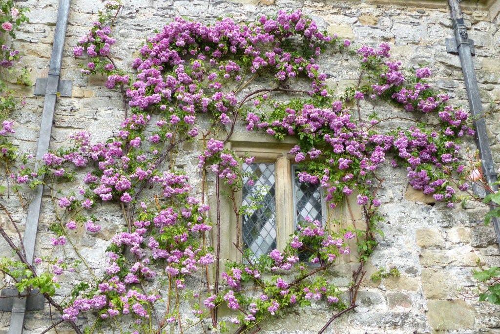Roses climb the stone walls of the house and create a hazy rainbow of colour that helps you to see how many different tones and hues there are in that stone. The plants at the base are colourful, too, with the blousy but short-lived irises, peonies and oriental poppies in no way upstaged by the loveliness above.