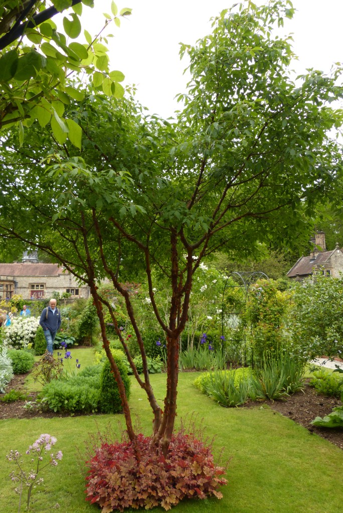 The lower terrace, the scented terrace, has long borders and gravel paths on the outside, filled in at the centre with grass in which sit what I remember as a slightly random layout of beds. To be fair it probably wasn’t random at all, but there were so many plants any formality that might have been aimed at was lost in the nicest possible way. The planting was a rich mix of trees such as Indian bean tree (Catalpa bignonioides) their crowns lifted to allow plenty of underplanting, and an enthusiastic array of mixed bulbs, herbaceous plants, shrubs and grasses.