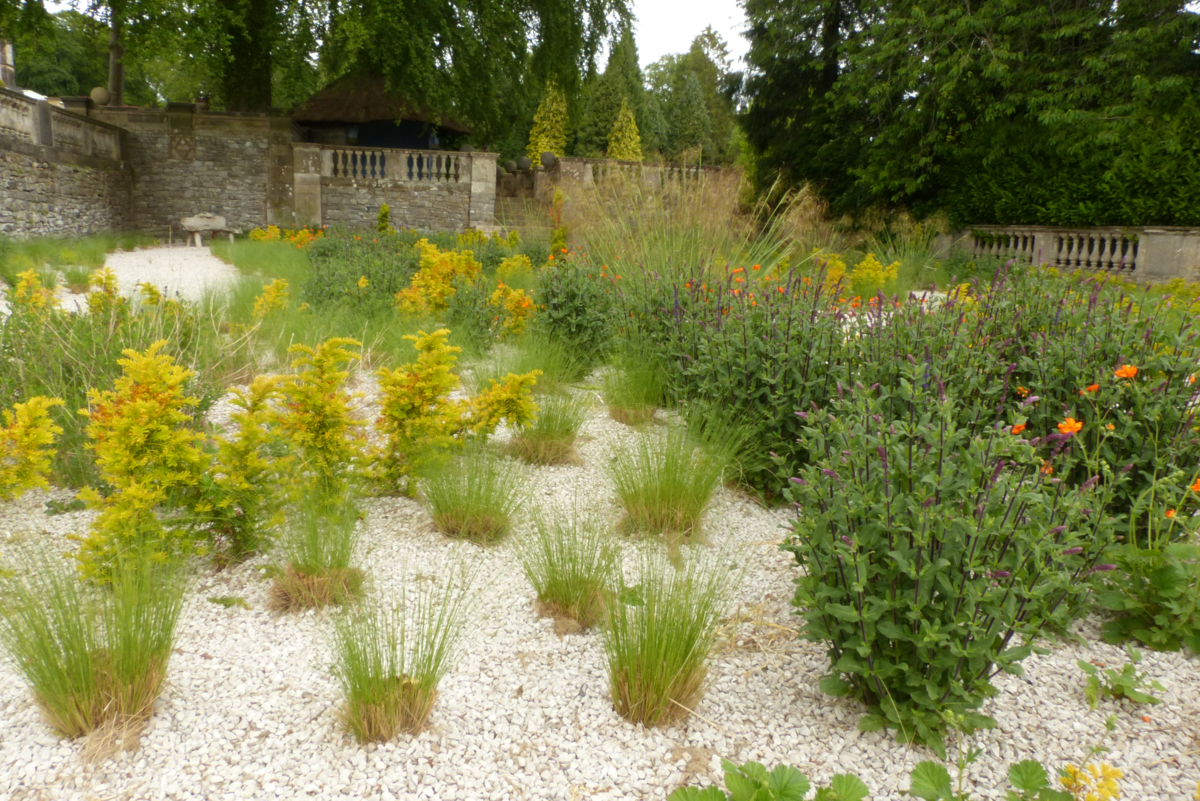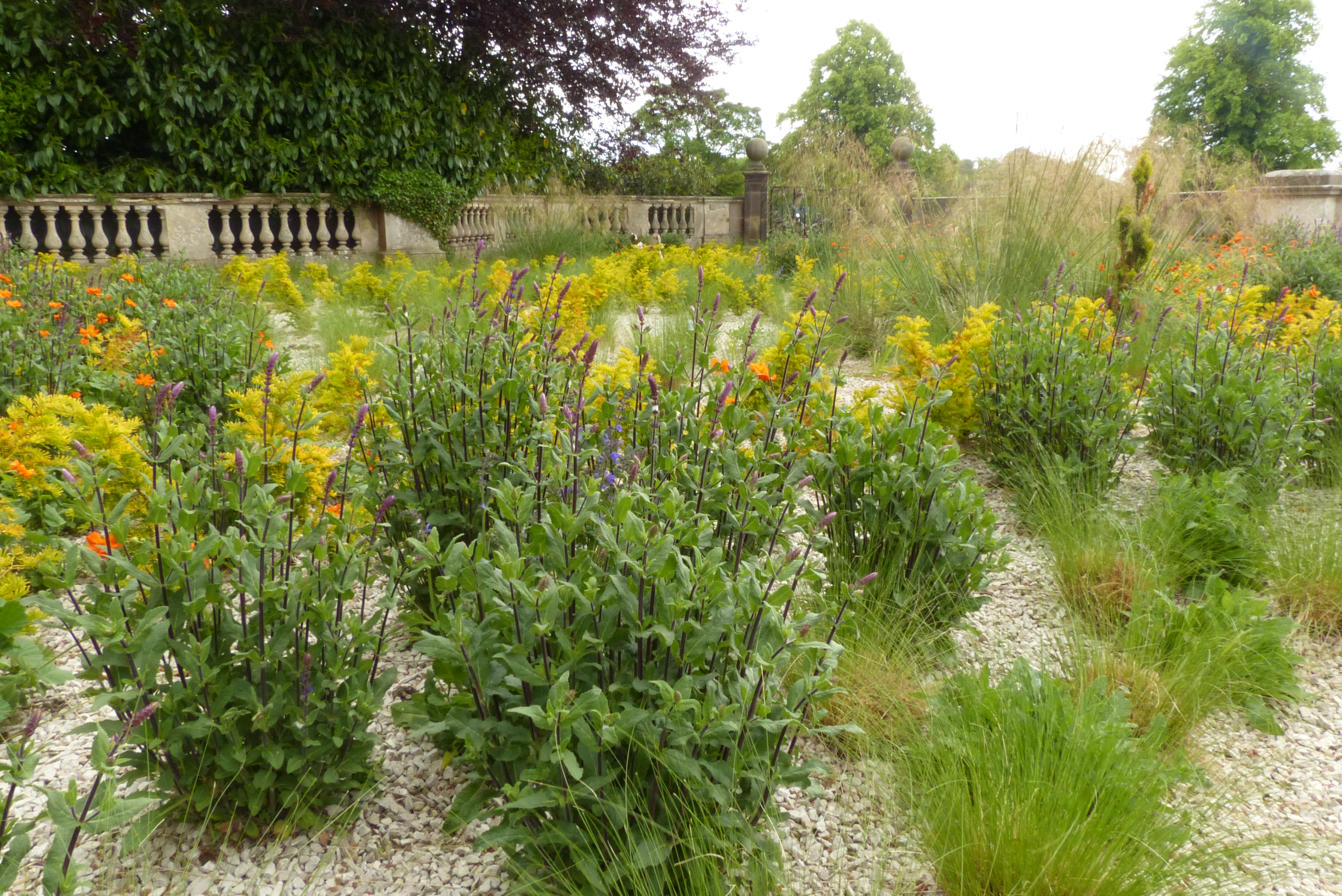This wasn’t the only revamped area, though. Further afield was the modern knot garden which had been completely re-planted a couple of years earlier. It was difficult to imagine how this might look in the future because the structural plants – the golden yews, were still so small. Also, as it was only June, the herbaceous plants weren’t fully grown or fully in flower, so some of their impact was lost as well. You could see the overall plan, though, and get an idea of what the intention is. Purple salvias combine with orange geums and whispy Stipa tennuisima in sinuous shapes that are shot through, rather than enclosed by, curved lines of the golden yews. The flowing shapes suited the informality of the herbaceous plants and grasses they’ve used, but was hard to tell how it will mature. I’d love to see it again in a few years time.