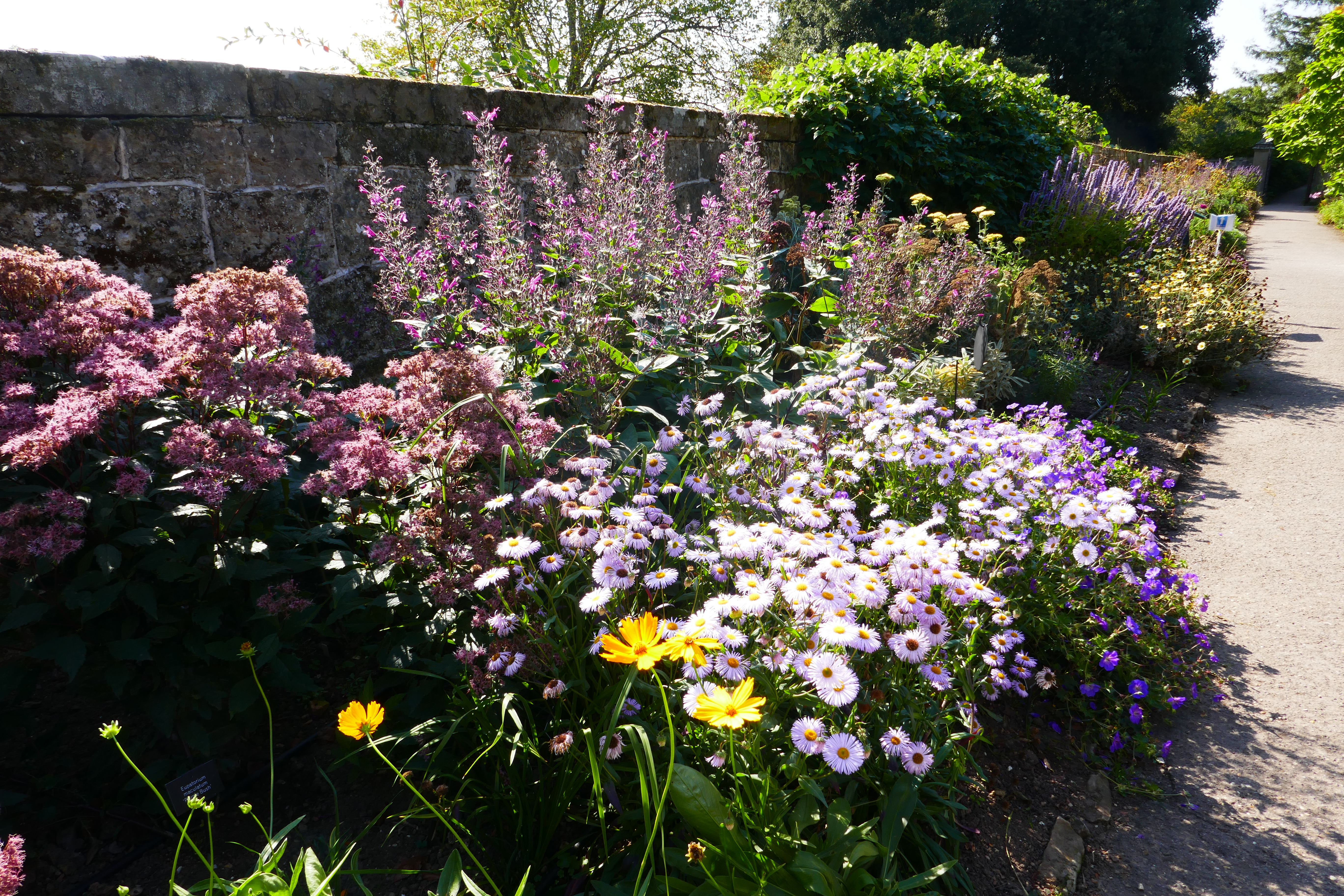 In front of the house, beyond the lawn, the Paradise Walk border runs to the West along a wall which gives views of the fields beyond. It was recently designed by Chris Beardshaw but problems with plant deliveries earlier in the year meant that some plants had only recently gone in and some were still to be added. Even so, the late summer show was already impressive, with purple agastache, asters, hardy geraniums, a compact Joe Pye weed (Eupatorium maculatum ‘Purple Bush’) and salvia-like Lepechinia hastata, combined effectively with yellow flowers of achilliea and various daisies.