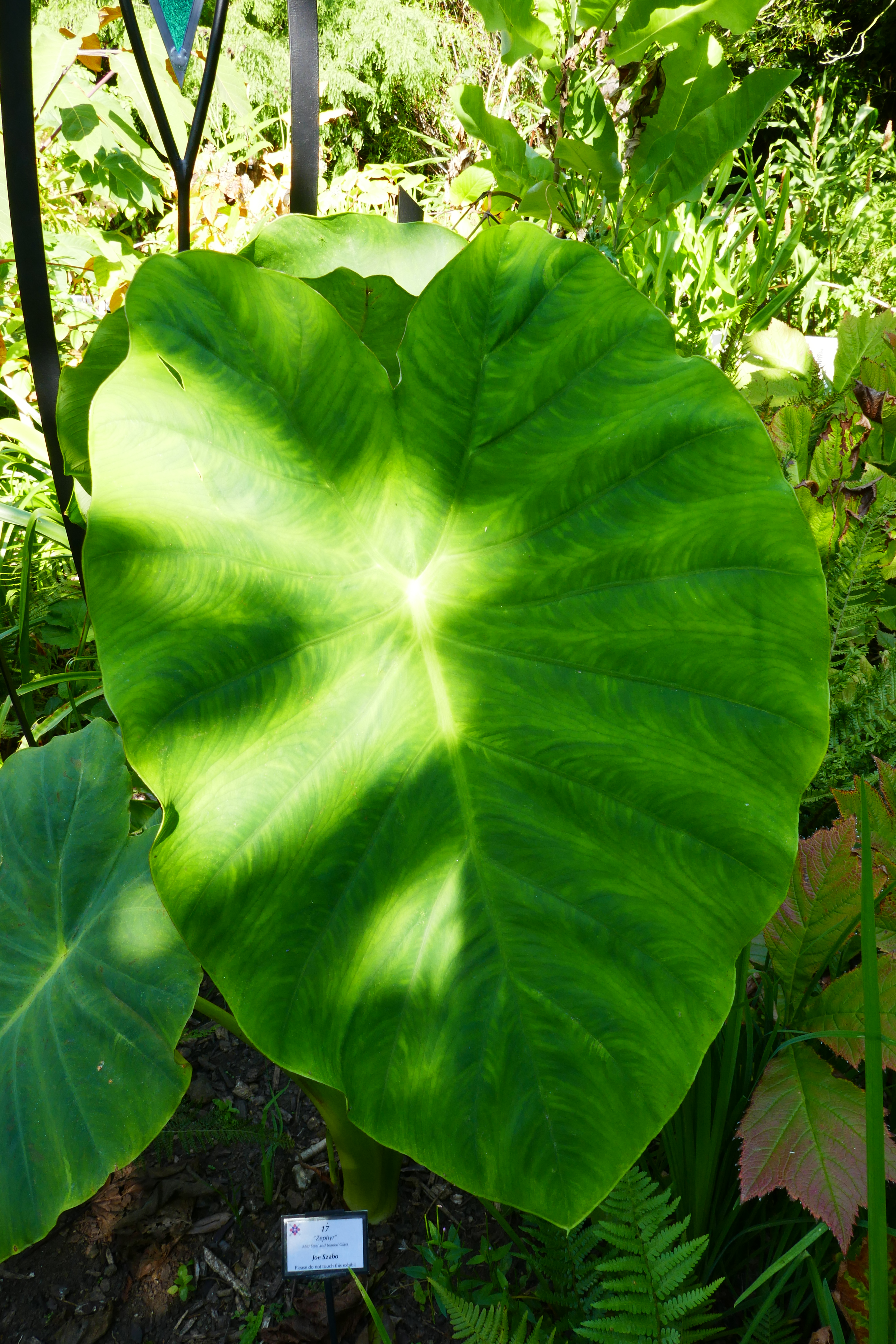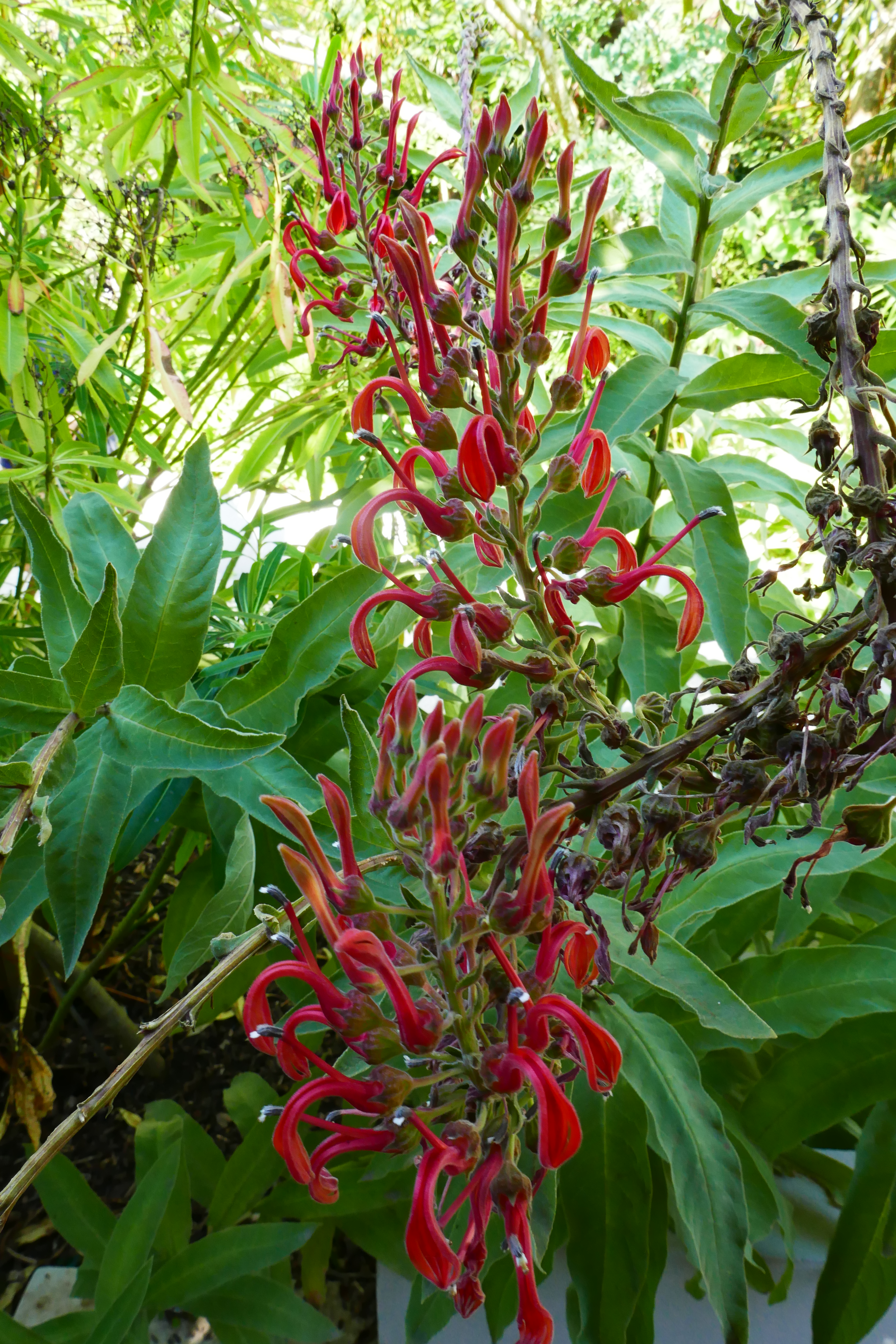 Nearby, the old potting sheds area of the garden has a very different feel. Here what remains of the potting shed walls is cleverly used to create shelter for tender (and some tender-looking but in fact quite hardy) exotic plants, a theme which extends through the Round Dell. Plants here include Lobelia tupa, tetrapanax, colocasia, banana plants (in flower although apparently they don’t produce fruit), indigofera, ricinus communis, abutilon megapotanicum, lagerstroemia indica, tender salvias, palms, and much more besides; this area was crammed with interesting plants.