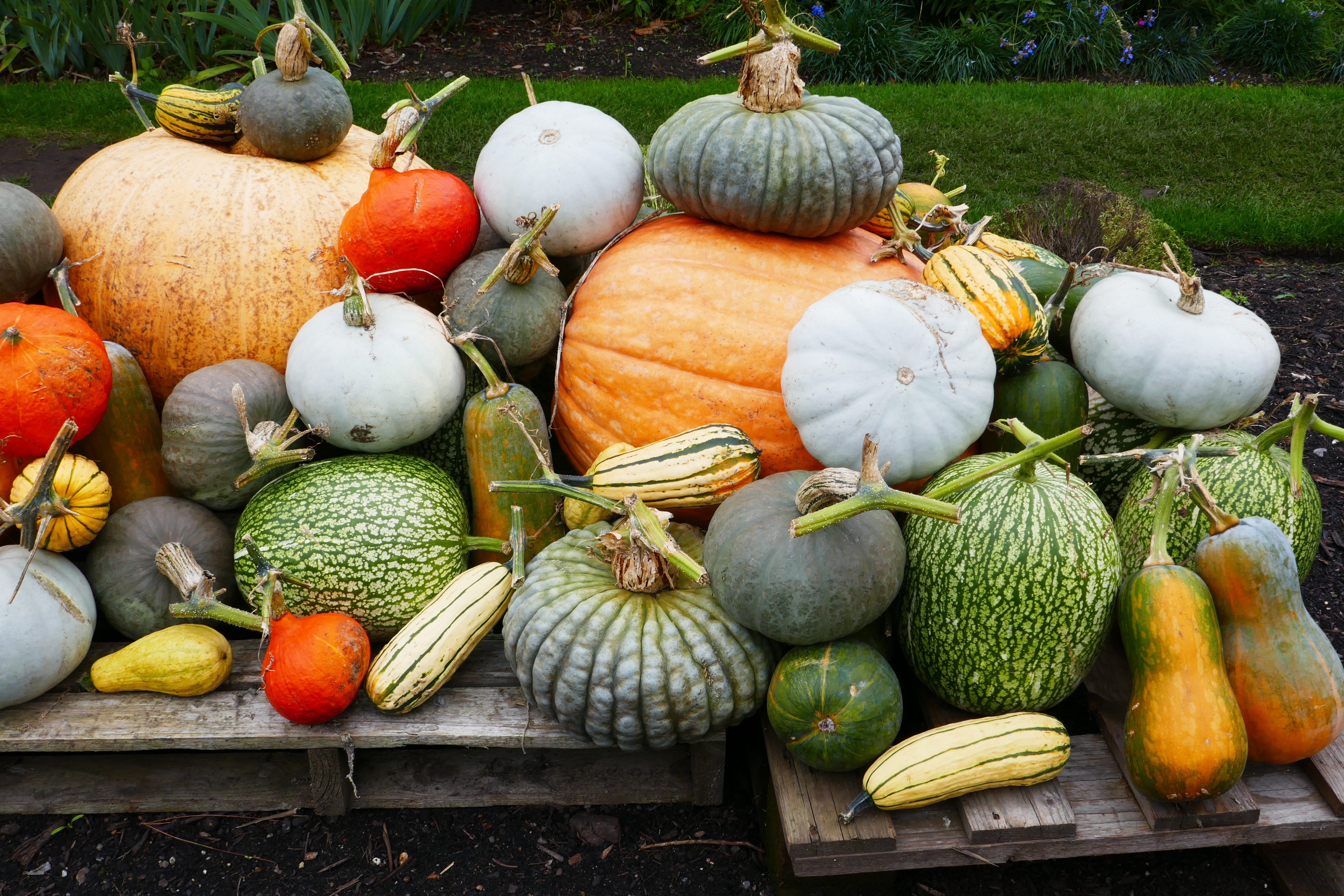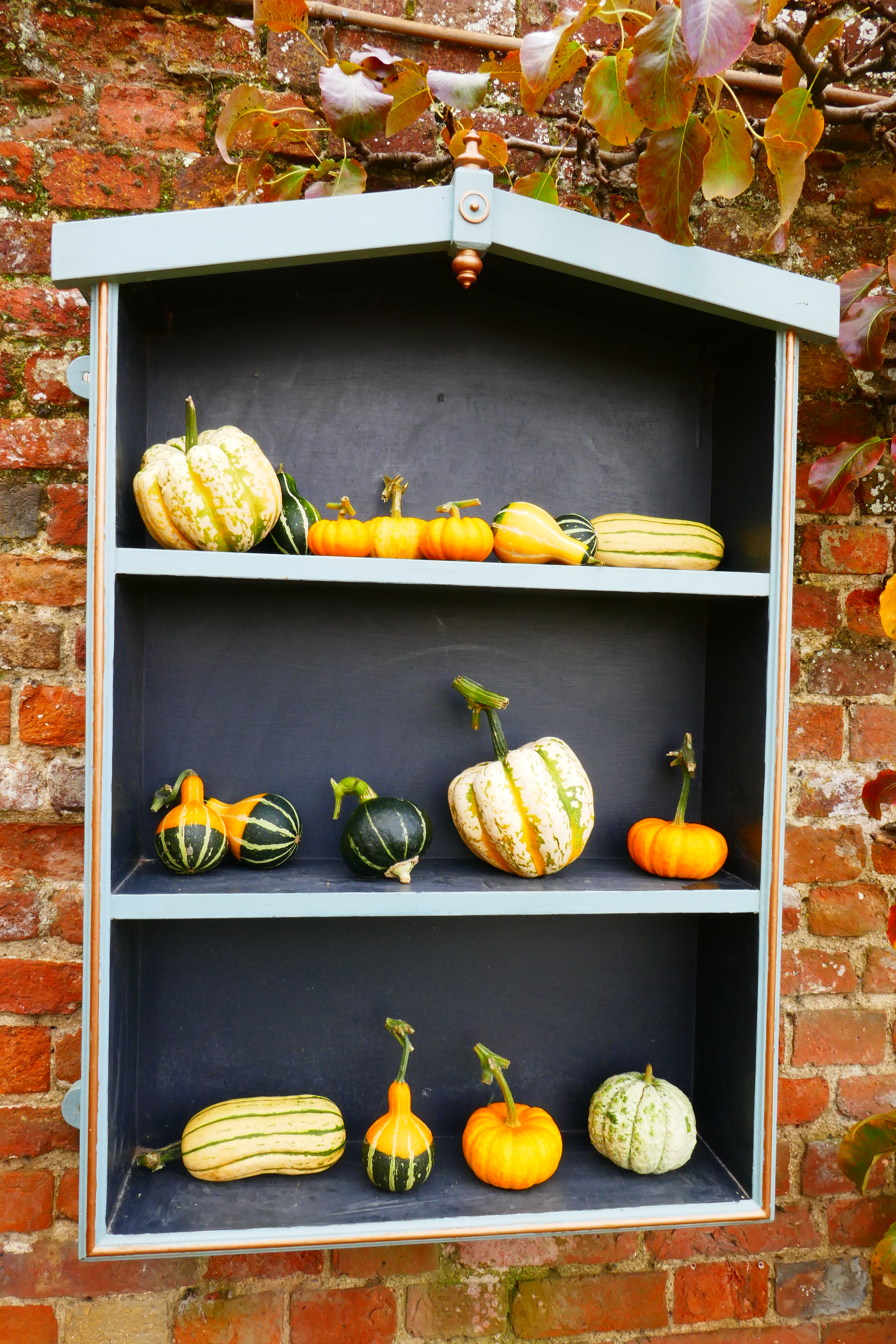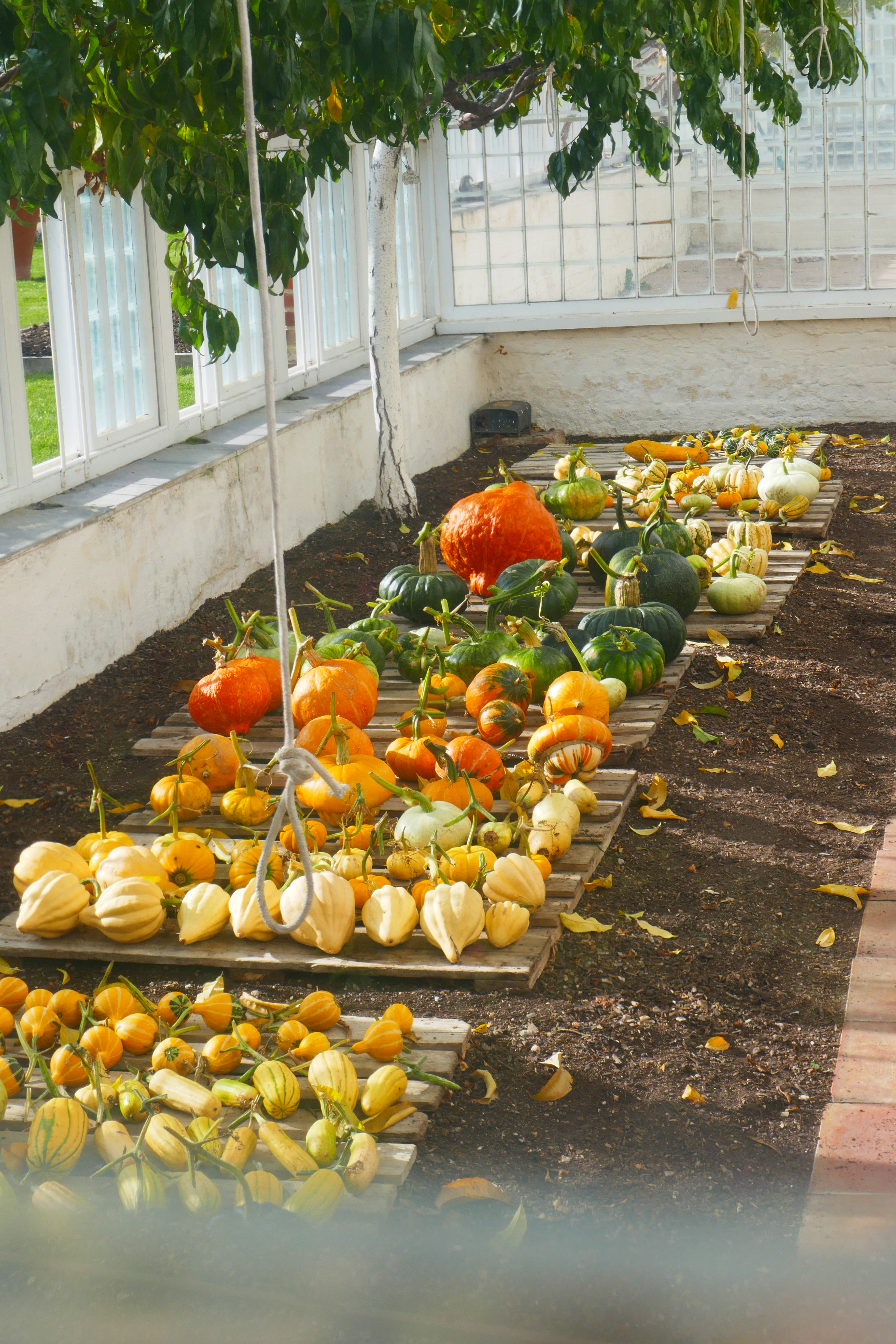 Pumpkins and squash seemed to kick the season off. By the time these were being harvested and left in the sun to ripen in October, dusk was already noticeably early and the clocks were soon to go back. The greenhouse and pumpkin theatre in the pictures below were at Audley End, the huge display of squash, pumpkins and gourds of all shapes, sizes and colours was at Kew Gardens.