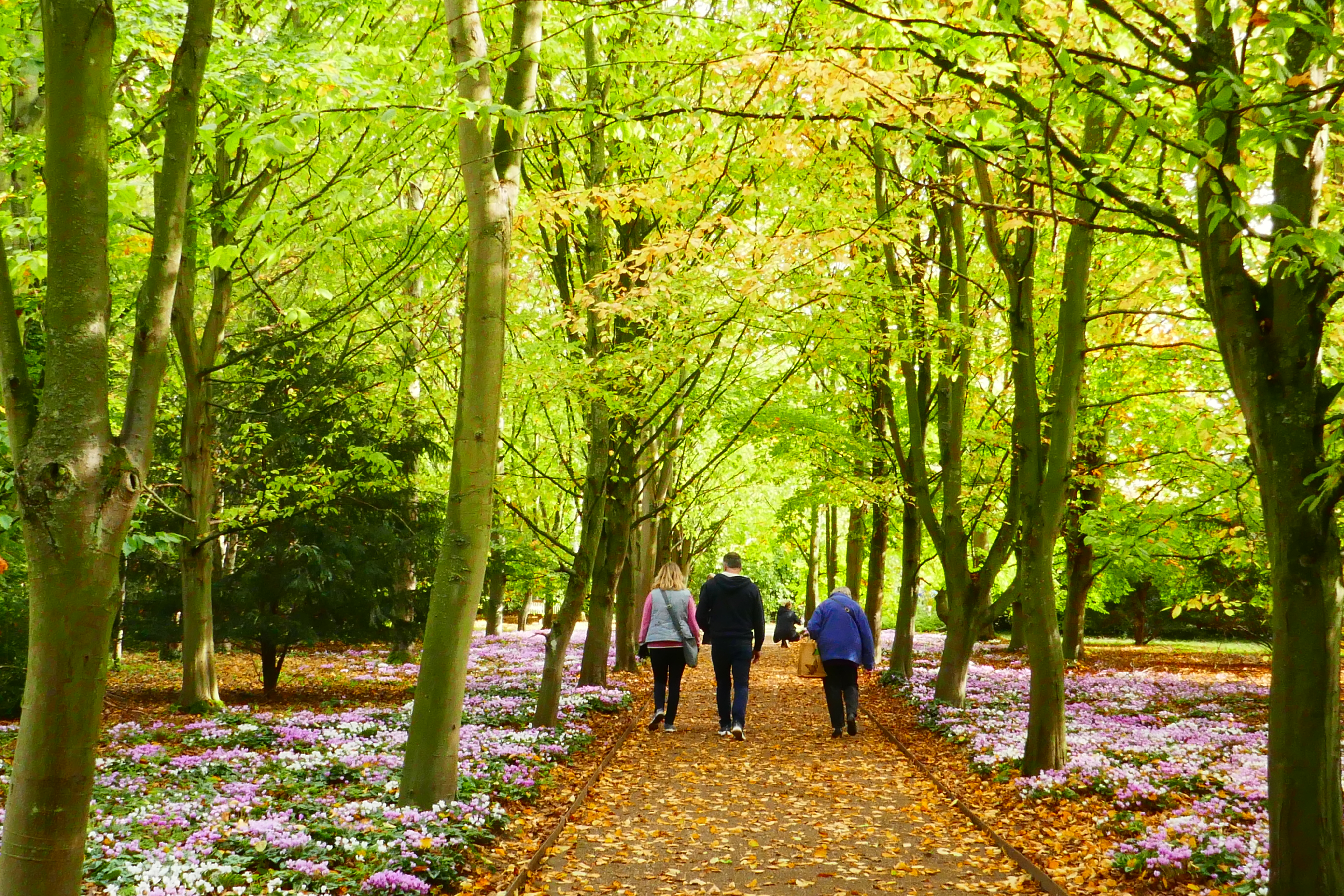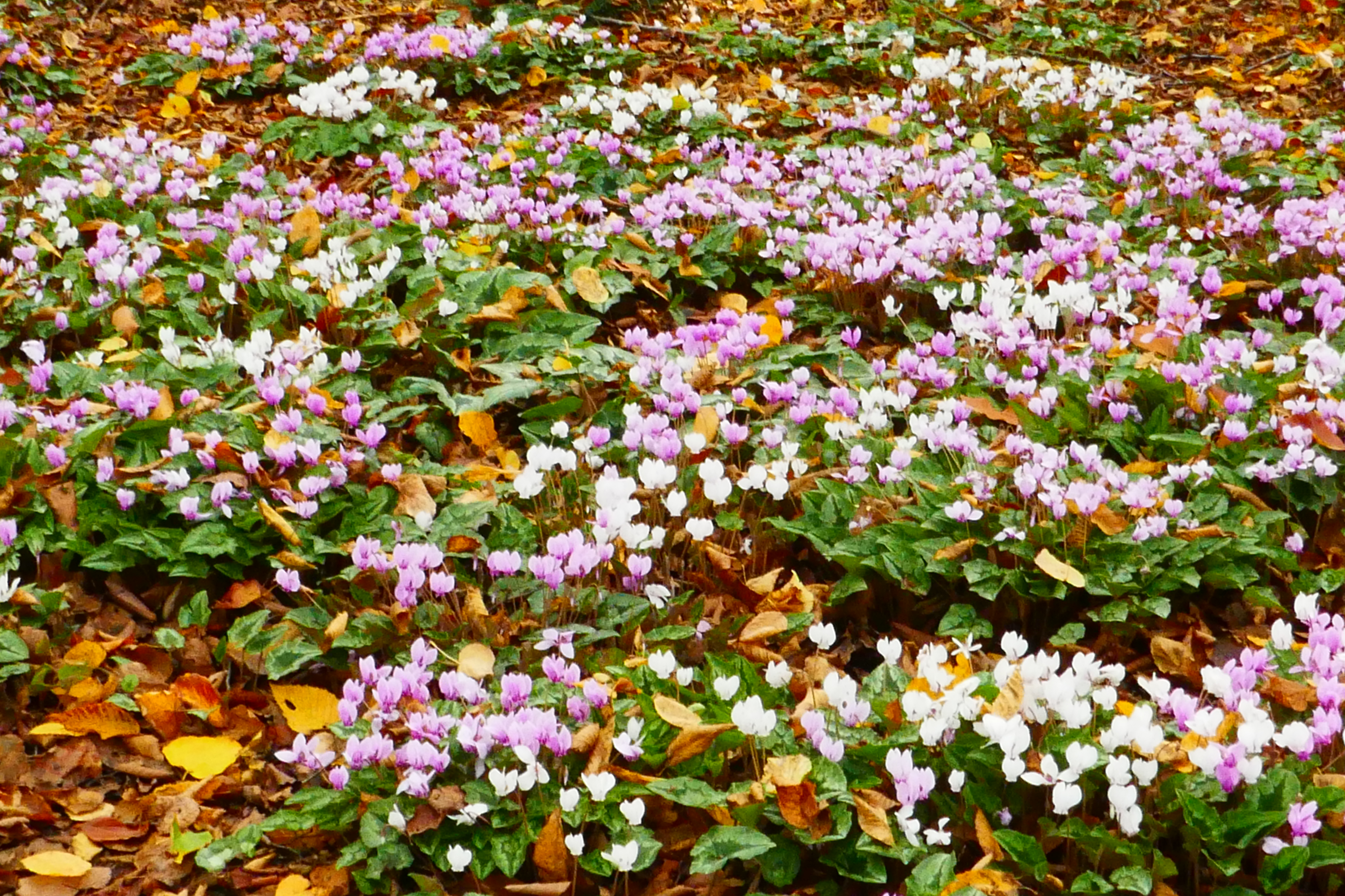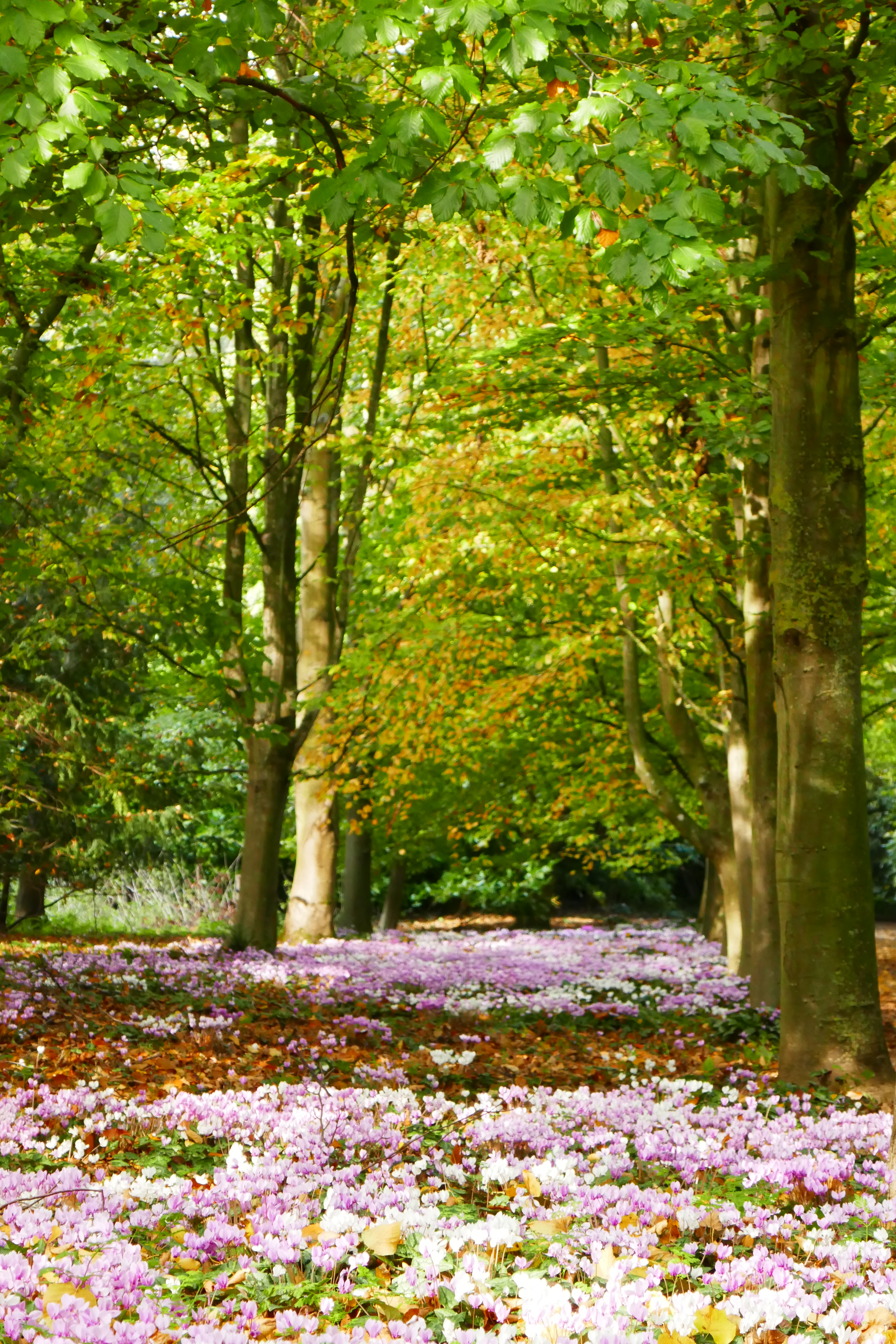 Meanwhile, some flowers are just getting underway. Autumn-flowering cyclamen (Cyclamen hederifolium) can start blooming in late summer, before their marbelled leaves appear, and keep going well into autumn. I haven’t come across another display quite as impressive as the carpets of cyclamen at Anglesey Abbey, seen here sheltering under gently colouring trees that filter the low sunlight into a golden glow. You have to marvel at the resilience of nature when you see how well plants can adapt to a difficult time of year and a part of the garden where few other things would flourish, and come up with a show like this.