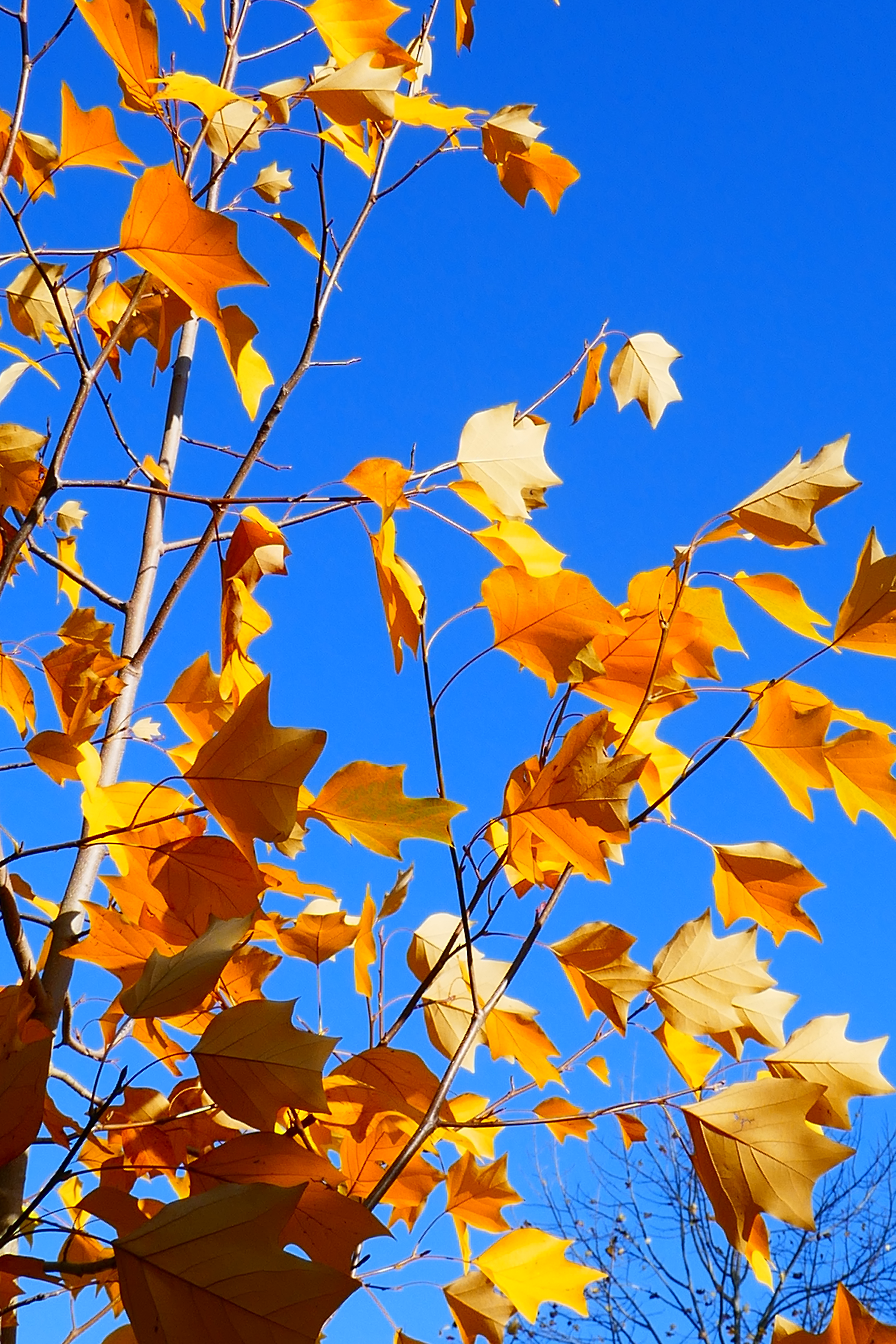 As I mentioned earlier, sunshine definitely helps everything to look its best and in early November, despite a fluctuating forecast, I managed to visit RHS Wisley on a very good day. They have lots of fantastic maples, as well as swamp cypress (Taxodium distichum) around the lake and an unusual Tulip tree (seen here with its yellow leaves being shown off to perfection by a clear blue sky).