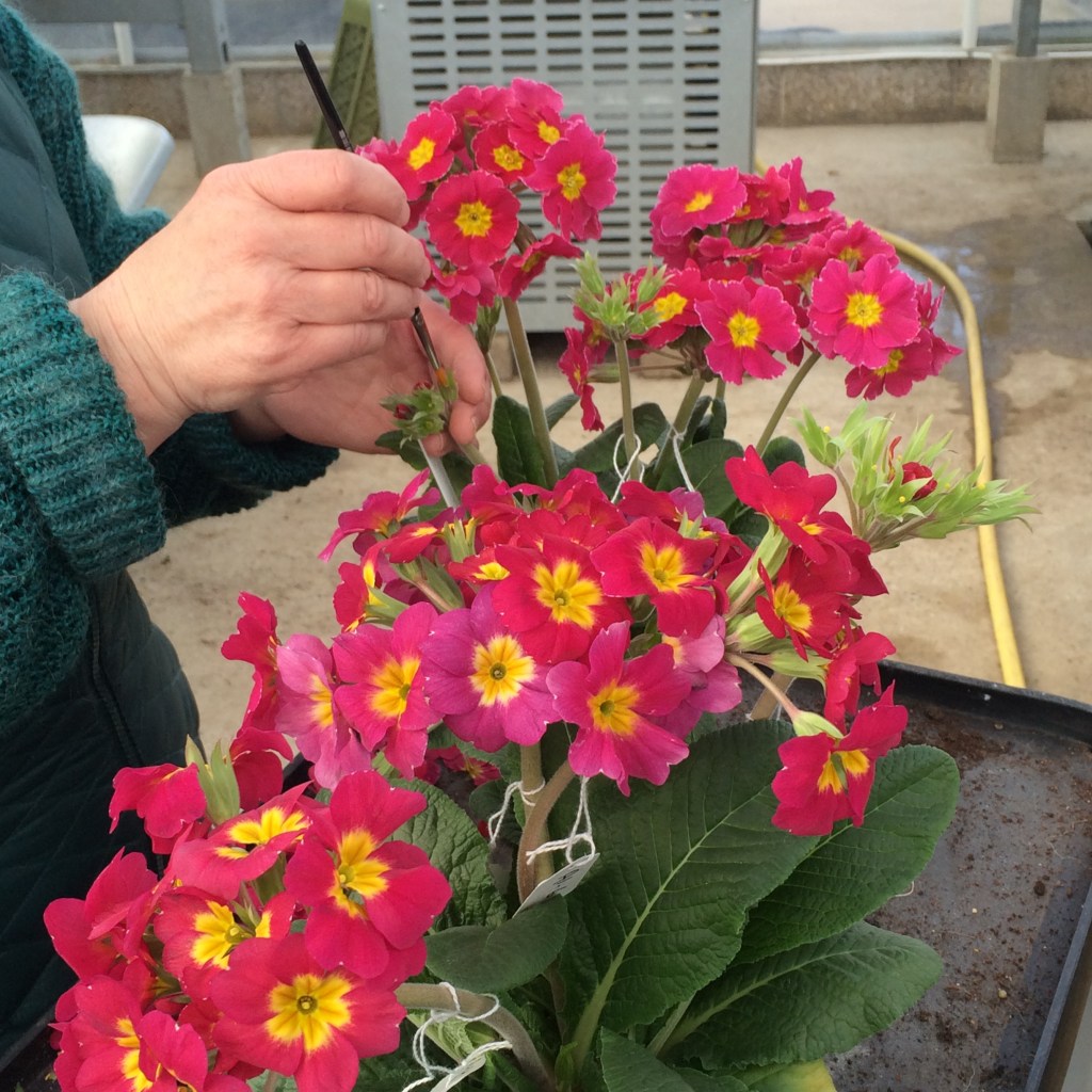 But arguably the most significant recent series of primroses (and probably my favourite) was bred in Cambridgeshire. David Kerley, who has also bred some of the most successful double Petunias including the well-known Tumbelina Pricilla (named after his wife), has produced a fabulous range of double primroses called Belarina. These combine beauty with toughness and they grow well in borders or pots. Kerly & Co is a family business involving David, Priscilla, their son Tim and his wife Sarah. Priscilla’s hands can be seen holding a brush with which she’s cross pollinating flowers in the pic below, and you’ll see that each stem is labelled with the name of the male parent variety the pollen was taken from.
