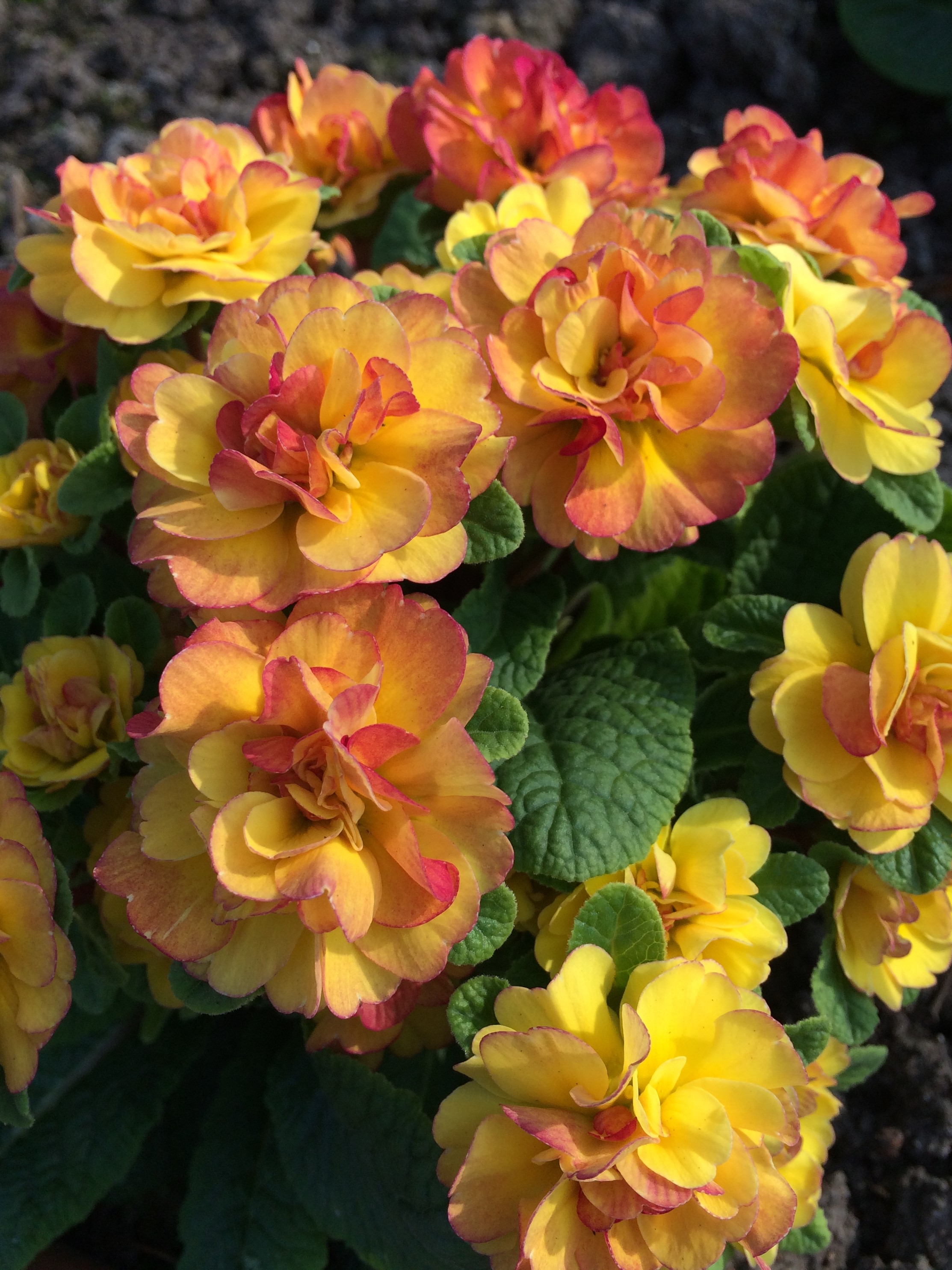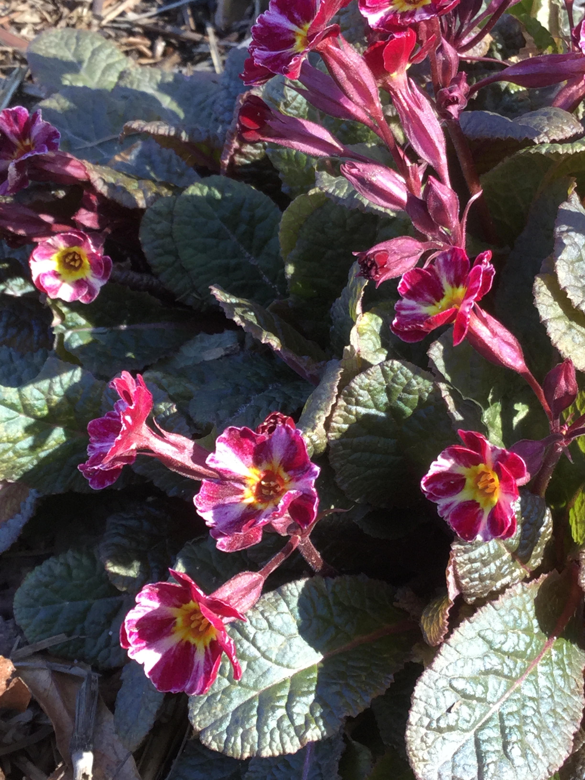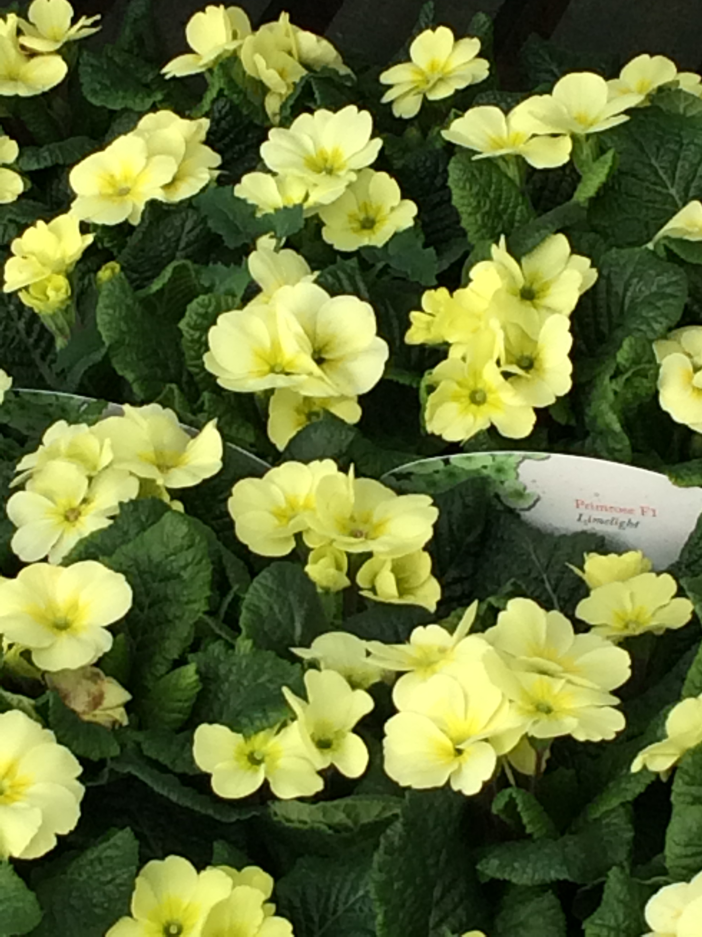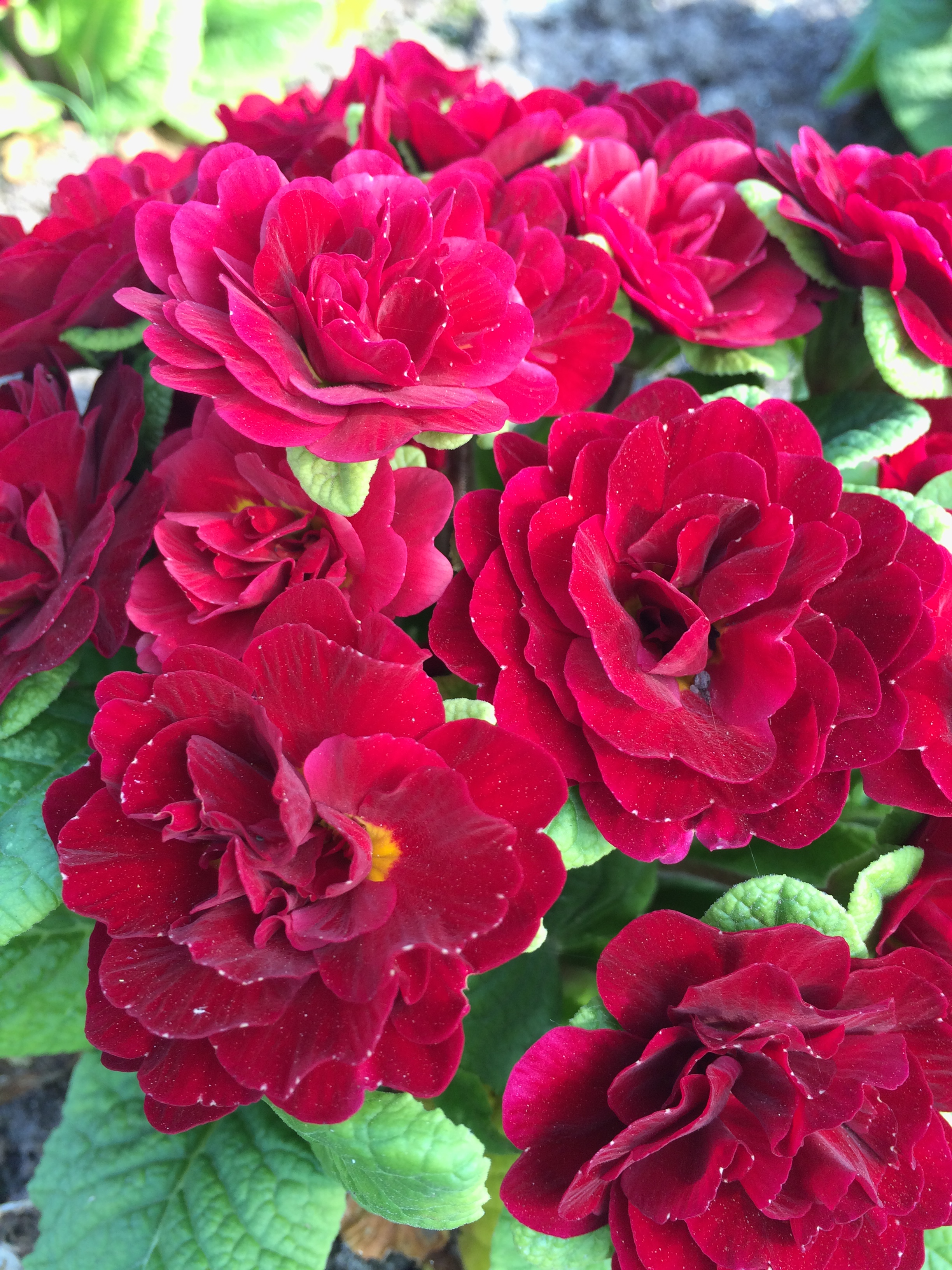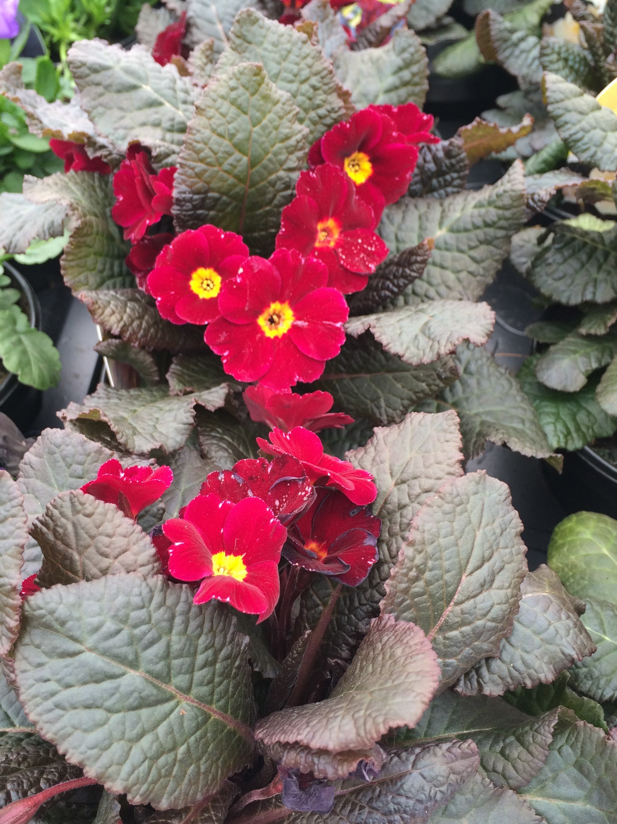 In the pictures below you can see some of the many fantastic Belarina primulas. The dark red one is called ‘Valentine’, then there are two pictures of ‘Nectarine’, then ‘Cream’, ‘Buttercup’ (each flower nestling in a collar of leaves) and ‘Amethyst Ice’. There are many more.