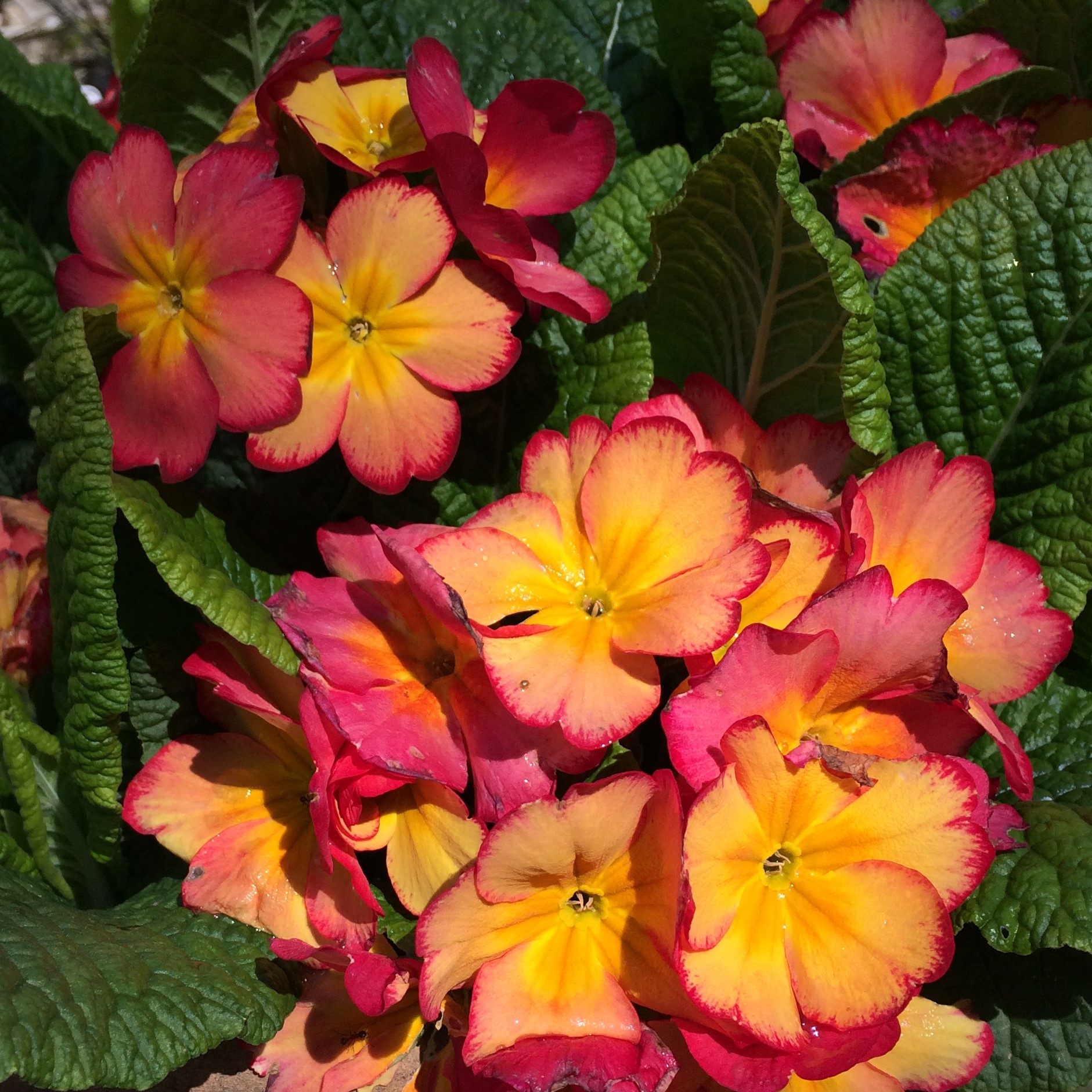 Another range I’ve found successful, with good staying power and a nice range of flower colours, was bred in Ireland. Kennedy Irish Primroses have distinctive dark green-bronze leaves and modestly-sized flowers in shades of apricot, yellow, red and pink. The pictures show ‘Dark Rosaleen’ (a polyanthus as you’ll immediately spot from the way the flowers are in clusters on a stem) and ‘Innisfree’ (an acaulis type of primrose with flowers on individual stems)