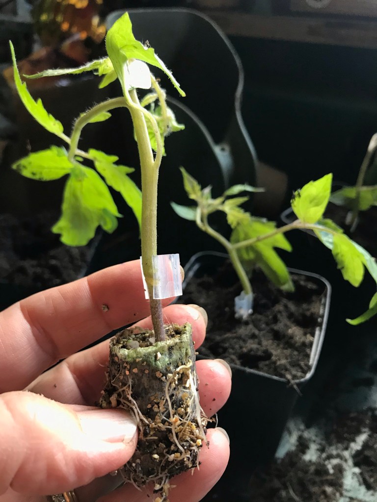 I wanted to grow a new blight resistant tomato variety called ‘Crimson Plum’, so I ordered some plants and they happened to be grafted. When they arrived they had these tiny plastic clips over the graft, presumably to protect the delicate join in the post but they also helped me to see exactly where the graft was on the stem. You need to know that because it should be kept above the soil level when you plant them up, otherwise the stem of Crimson Plum would grow its own roots and wouldn’t benefit from the vigour the graft gives it. Once you’ve planted them you need to take the clip off, of course, because the stems won’t be that thin for long. To be honest, I’ve grown grafted plants before and I’m not convinced it gives them as much of an advantage as you might expect. The plants themselves get bigger than they probably would if they weren’t grafted and it’s meant to help with disease resistance, but in my experience you don’t necessarily get more of a crop.